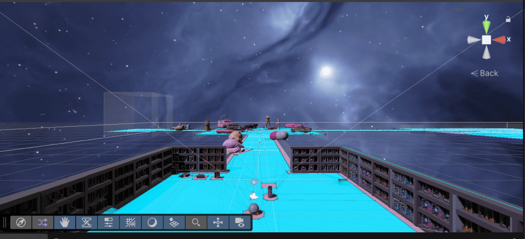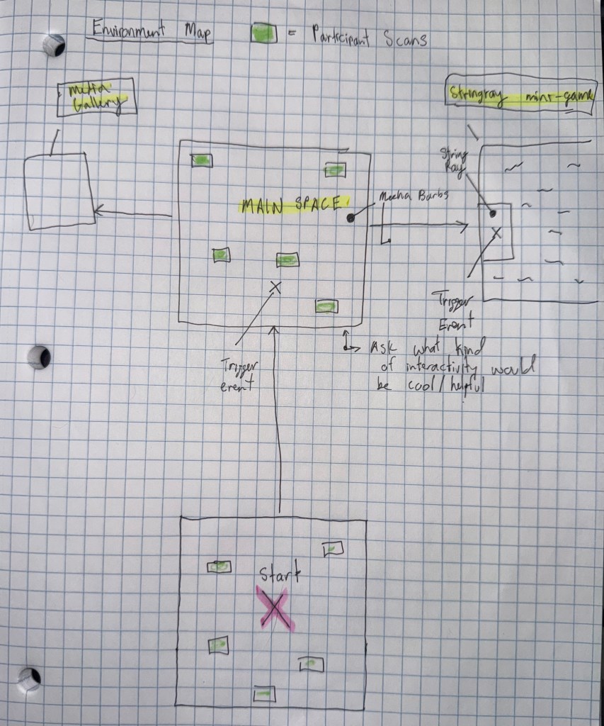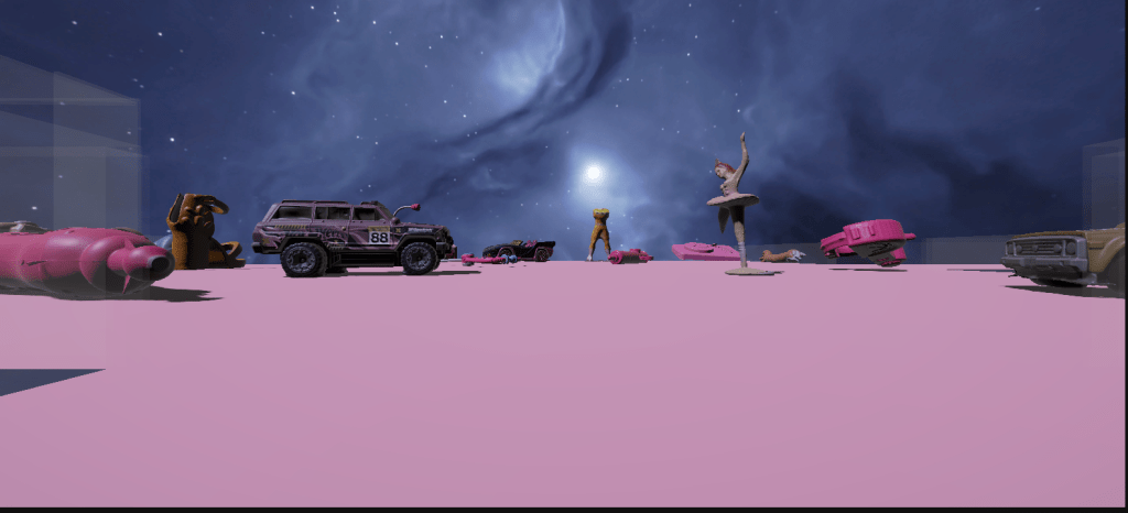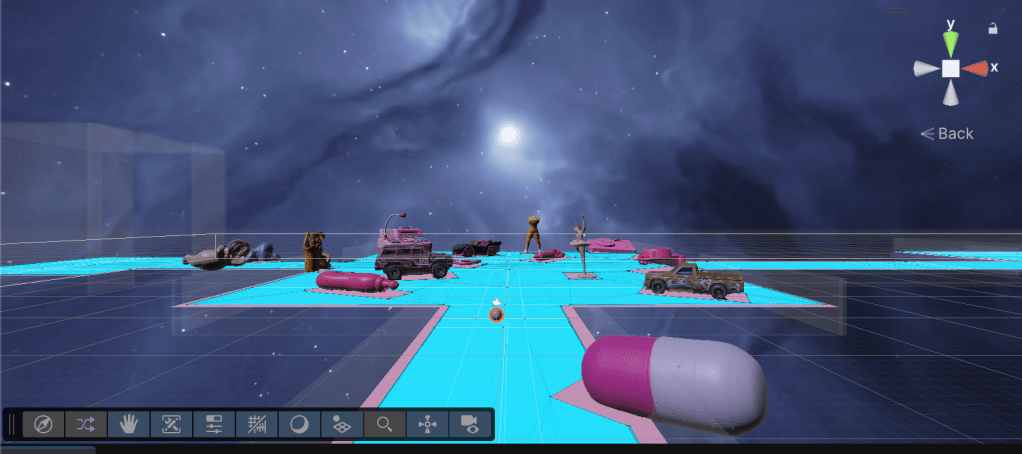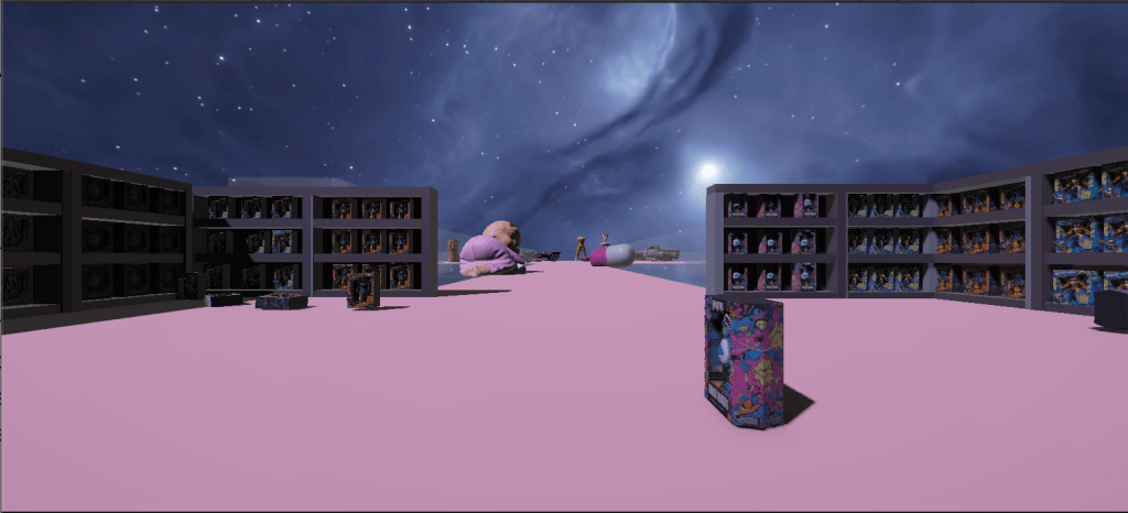 Following the development of the starting space, I decided that the center plane or main space, would be where the ‘player’ could interact with the 3D toy assets, interact with the Misfit Dollz 3D models, and trigger an interaction between MechaBarbz (or another misfit doll) narration that would explain the space and the concepts behind its design. The player then has two areas that can be explored, to the left, a Media Gallery and to the right ‘StringRay’s Surf Mini Game’.